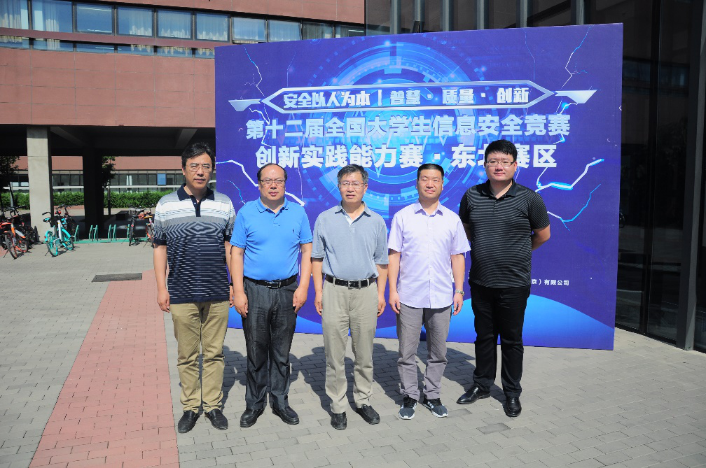 best365手机版官网领导与嘉宾专家合影(右起依次为杭州安恒信息技术有限公司东北大区总经理赵君,中科院沈阳自动化研究所尚文利研究员,best365手机版官网院长张斌教授,大赛组委会委员东北赛区负责人周福才教授,best365手机版官网副院长程维副教授)