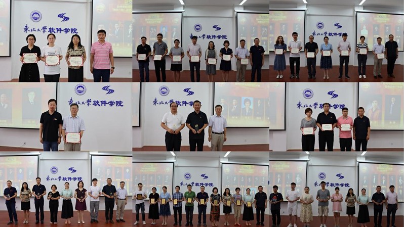 学院党委书记滕超宣读学院和学院党委关于表彰2019—2021年度“两优一先”、2020年度“两优一先”、“学习强国”学习竞赛年度表彰、2020年度学院先进集体和个人等各项表彰决定。由学院领导班子成员为党建类、综合类、人才培养类、科学研究类和其他类等获奖的集体和个人颁奖,并由院长张斌和书记滕超为光荣在党10年、20年、30年的党员和在院工作10年、15年的教职工颁发纪念牌。此次表彰特别设置了“爱生奉献奖”,表彰在2020年疫情期间主动帮助毕业生收拾行李和迎接2020级新生报到组成的“爱心车队”教职工。