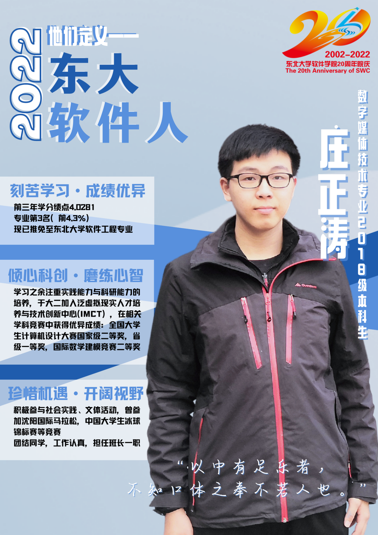 他刻苦学习,成绩优异,学分绩点4.0281,以专业第三名的成绩推免至best365手机版官网软件工程专业攻读硕士研究生。但你可能不曾知道,他也曾陷入过低谷,他说正是因为自立自强的精神,坚信“以中有足乐者,不知口体之奉不若人也”,才能够让他在前进的道路上披荆斩棘、扬帆远航!
