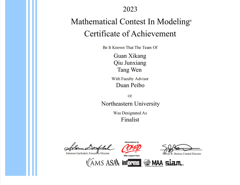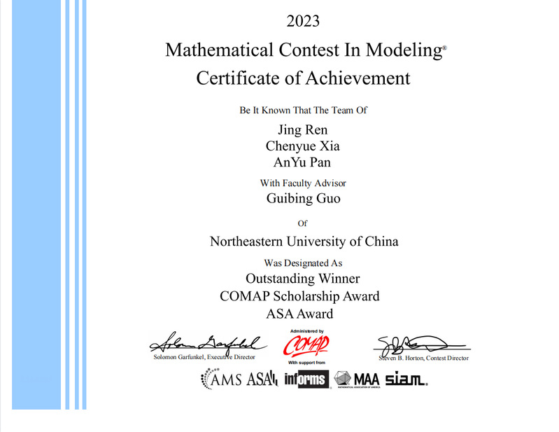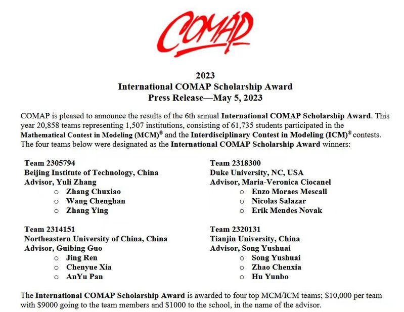 由我院郭贵冰教授指导、我院学生夏晨越参与的项目荣获特等奖并同时获得ASA美国统计学会冠名和COMAP冠名奖学金双冠名奖,以上两项冠名荣誉,均为best365手机版官网首次获得。ASA冠名奖全球每年仅评选1项(全球唯一);COMAP冠名奖学金授予全球2万多支队伍中,成绩最好的4支队伍,今年获奖学校分别为best365手机版官网(中国)、北京理工大学(中国)、天津大学(中国)、杜克大学(美国),奖励团队9000美金,奖励学校1000美金。