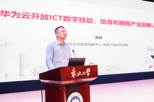 华为云开发者创新中心产品运营经理陈明分享“华为云开放ICT数字技能,培育和拥抱产业创新人才”,为现场师生介绍华为公司的发展历程,现阶段人工智能与物联网的发展趋势,以及华为公司在教育领域的不断耕耘:基于自主创新根技术,围绕昇腾、鲲鹏、欧拉、鸿蒙、HMS、高斯六大生态能力,开放数字技能,培育优秀人才,实现教育强国。